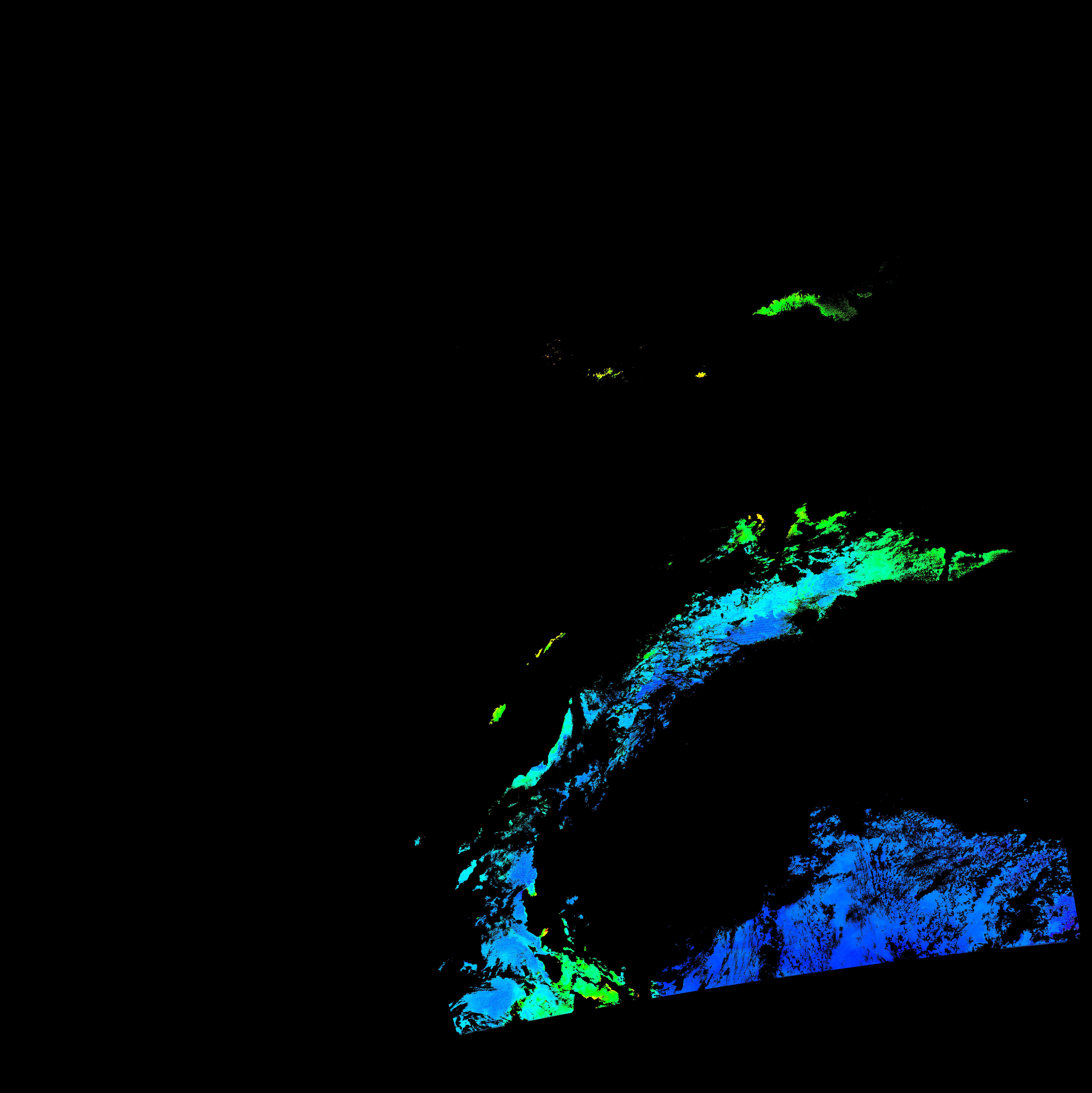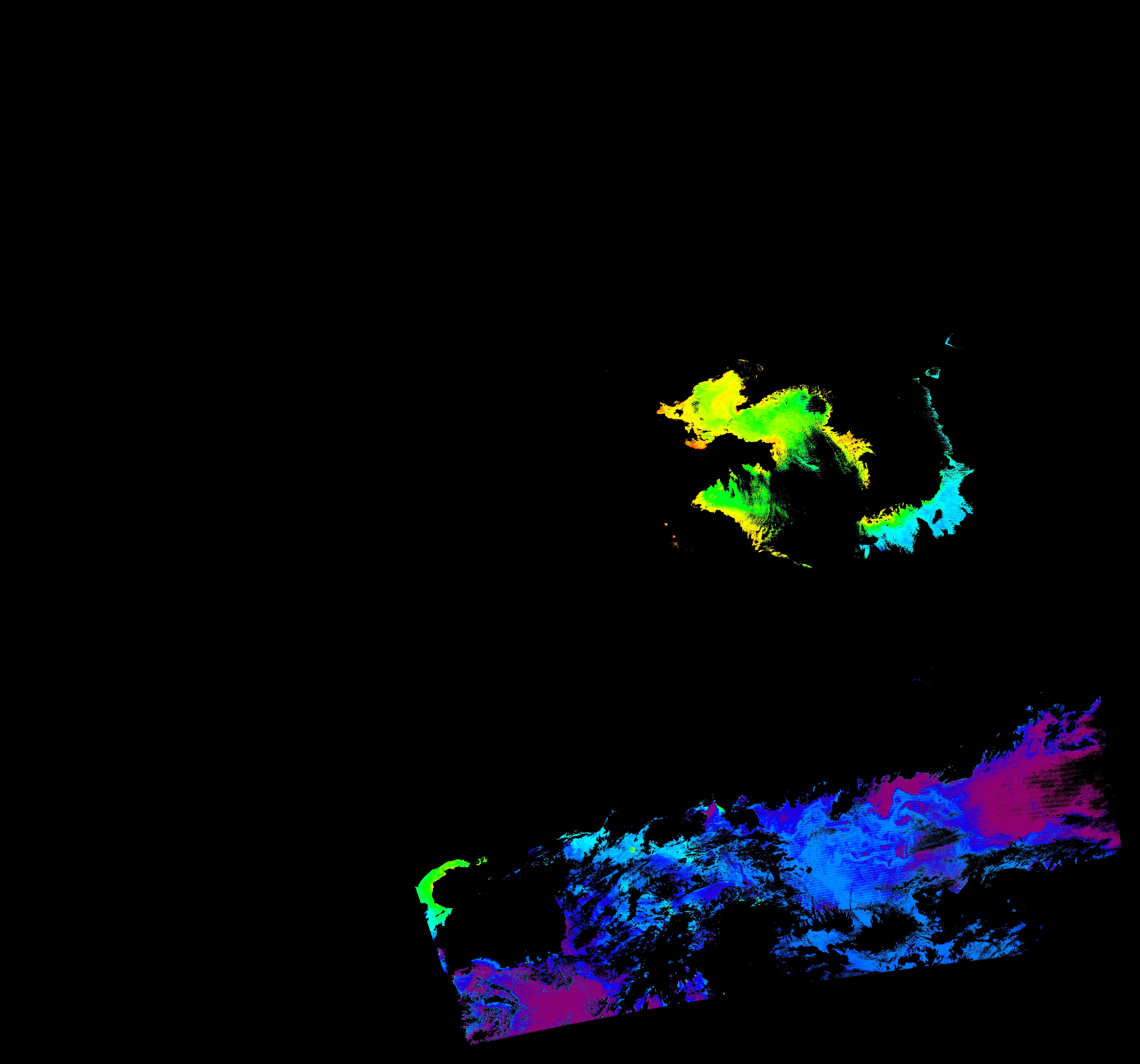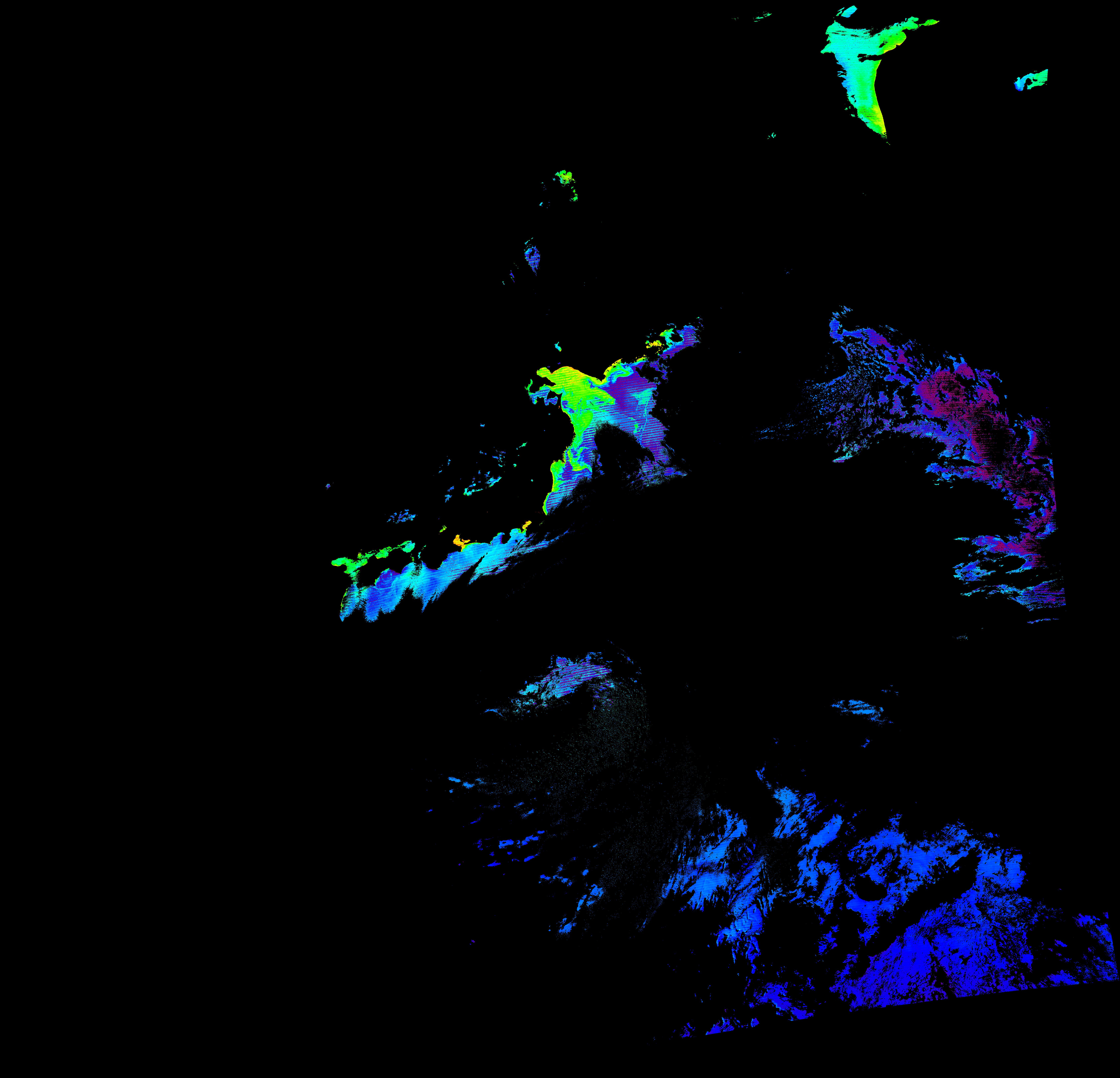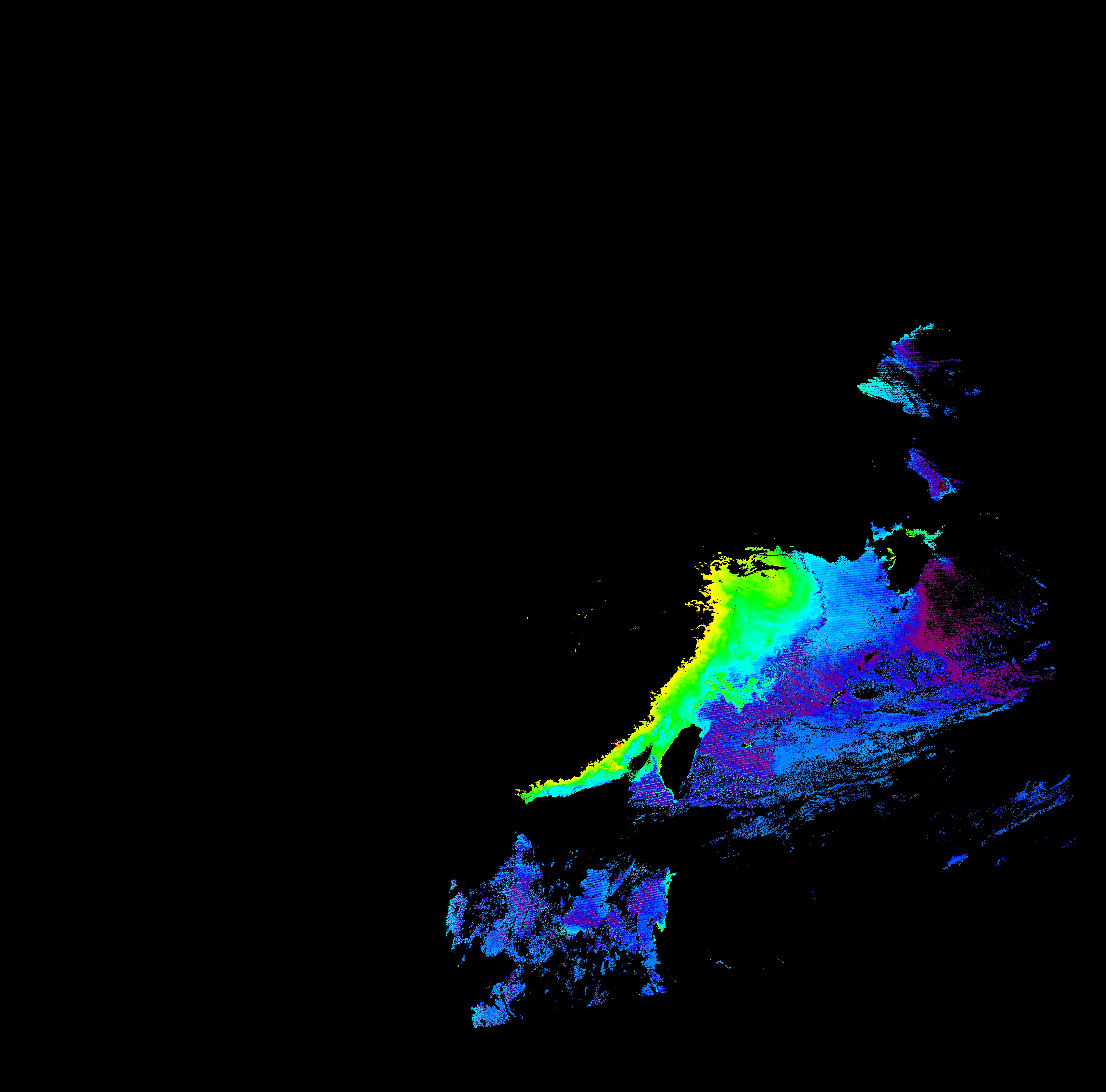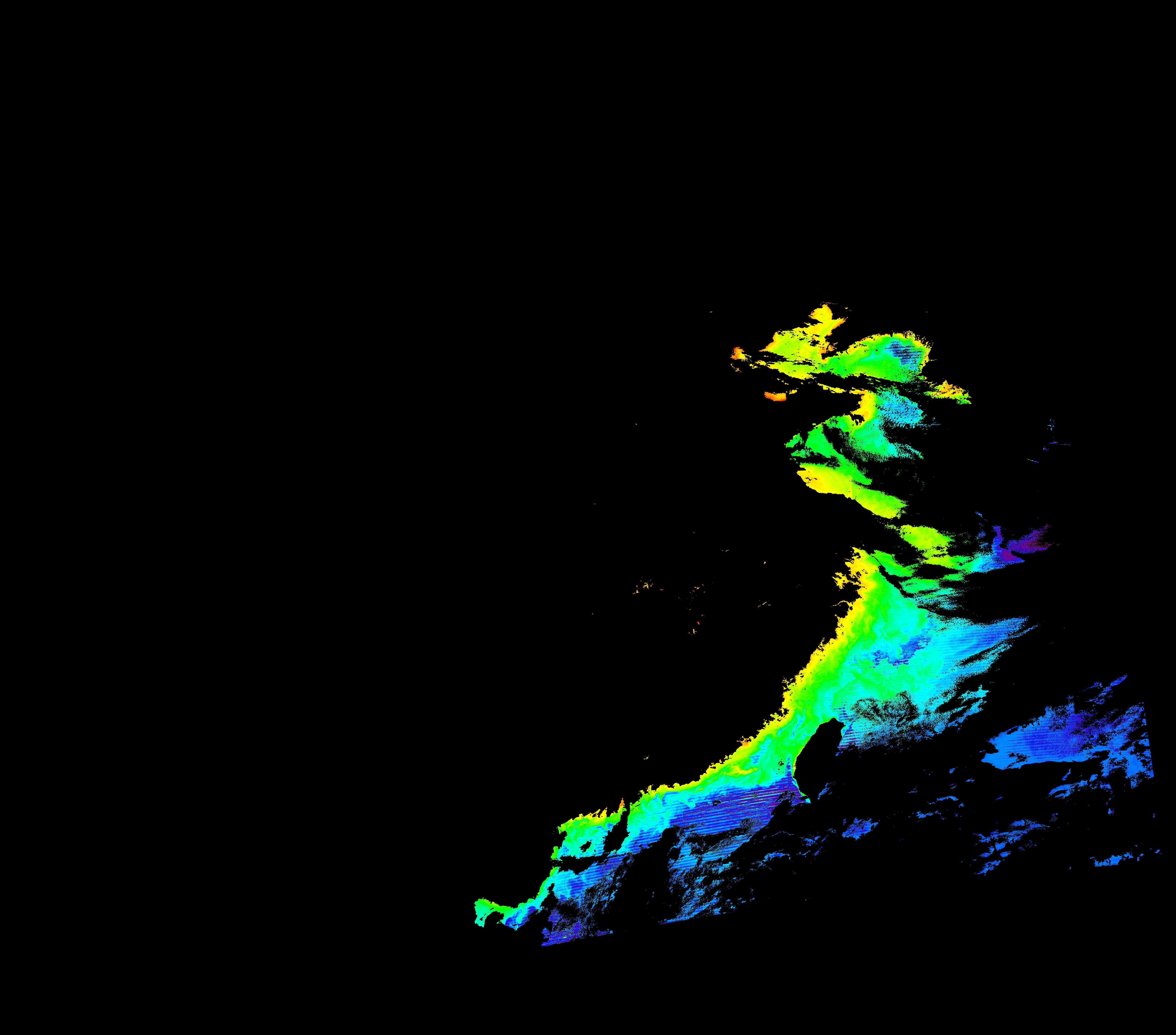 スオミ-NPP(S-NPP)に搭載された可視近赤外放射計群(VIIRS)は、可視波長帯域から、近赤外そして熱赤外波長帯域に感度を持つセンサーです。このサイトでは、農大オホーツクキャンパス(網走市)、情報大(千葉市)、農大宮古亜熱帯農場(宮古島市)の地上局において直接受信したVIIRSのデータから作成されたトル―カラー画像、海洋プロダクト、陸圏プロダクトをモニターすることが可能です。 Chl-a:0.01 to 100.0 mg m^-3 Chl-a=10^((geotiff_value-128)/63.5)